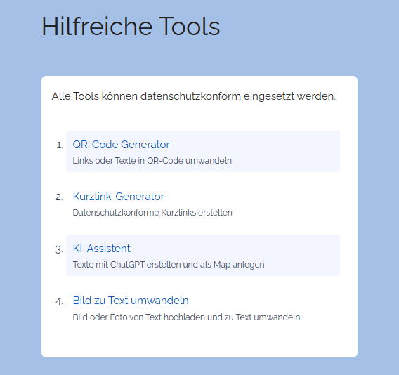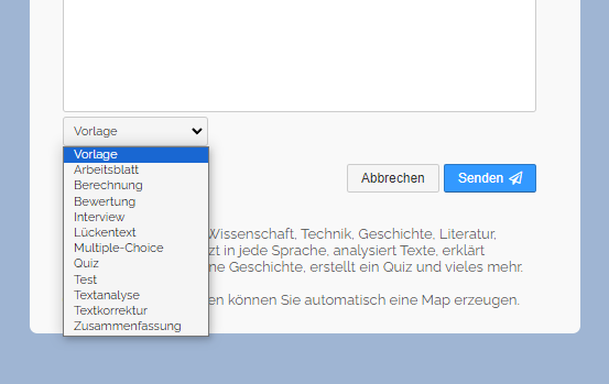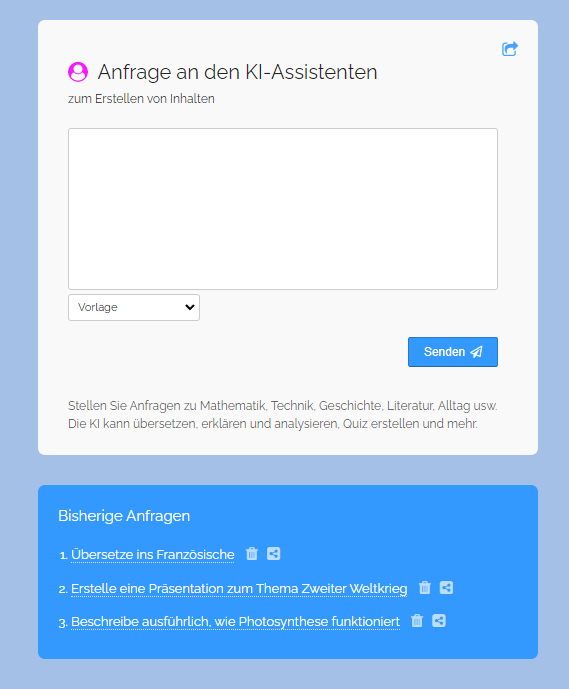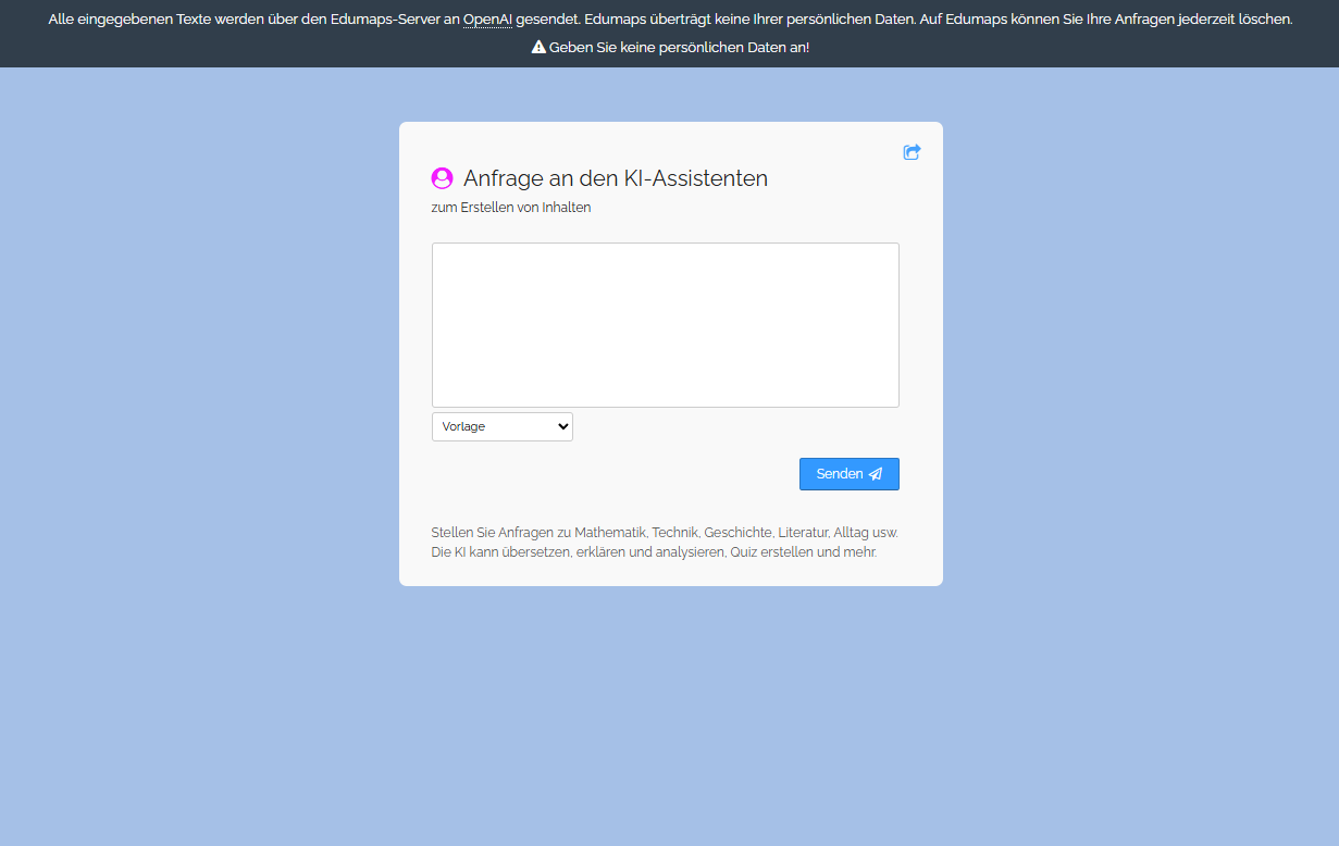 Alle eingegebenen Texte werden über den Edumaps-Server an OpenAI gesendet. Edumaps überträgt keine Ihrer persönlichen Daten. Auf Edumaps können Sie Ihre Anfragen jederzeit löschen. Geben Sie keine persönlichen Daten an.