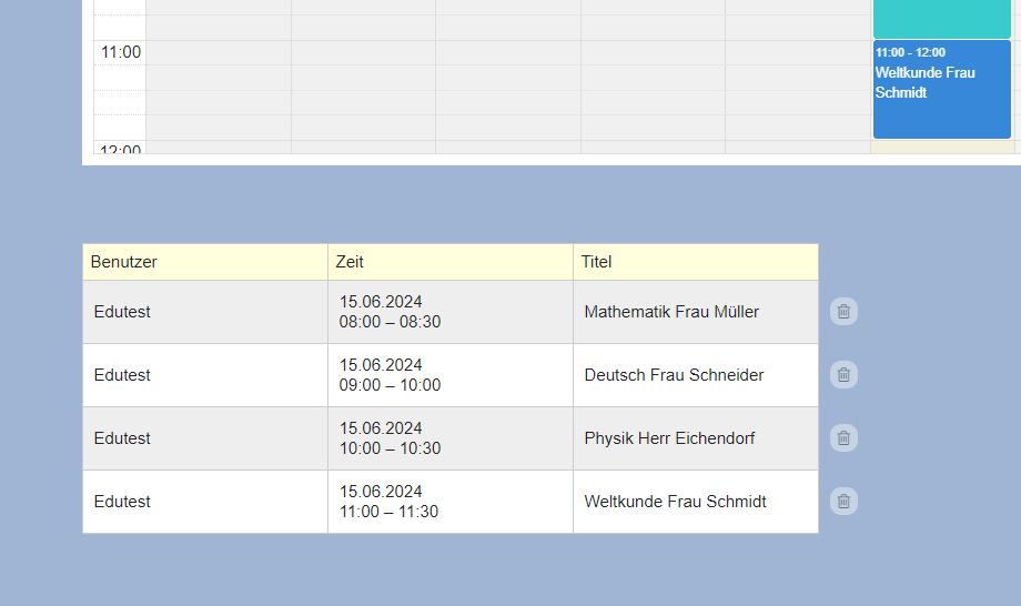 Alternativ können Sie den Termin in der Terminliste unterhalb des Kalenders mit Klick auf das Papierkorb-Icon löschen.