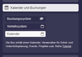 Um den Kalender für eine Box zu aktivieren, öffnen Sie die Box-Einstellungen und klicken auf „Kalender und Buchungen“ und dann „Kalender“.