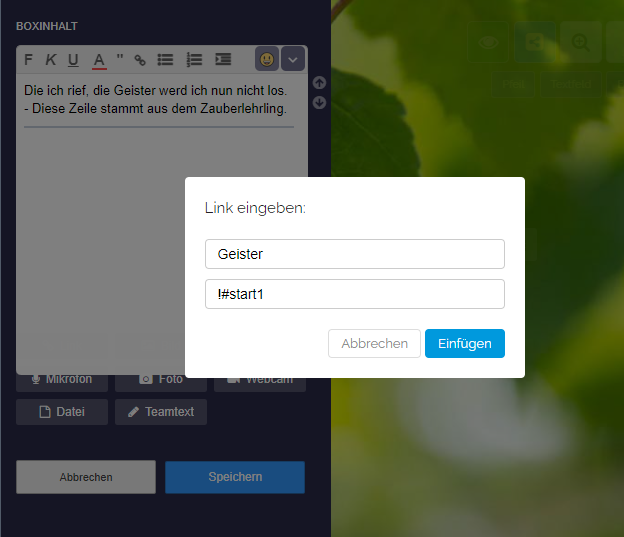- Öffnen Sie den Box-Editor für die Box, wo verlinkt werden soll.