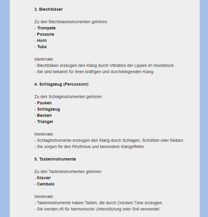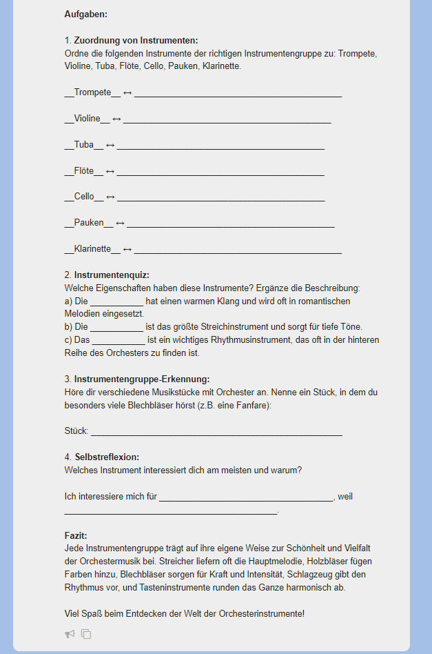 Entwerfe ein Arbeitsblatt, das verschiedene Instrumentengruppen eines Orchesters beschreibt. Niveau Realschule.