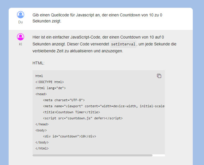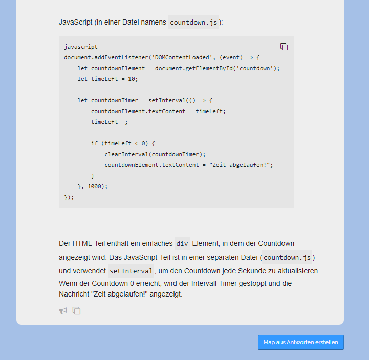Nun könnten die Schüler den Quellcode selbst ausprobieren und eventuelle Fehler finden - oder aber Änderungen durchführen, zum Beispiel einen Countdown mit größerer Zeitspanne zählen.